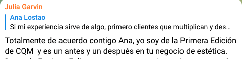 Para mí, Clientes que Multiplican ha supuesto un punto de inflexión en mi carrera como empresaria en el mundo de la estética, porque me ha hecho buscar en lo más profundo de mi ser qué es lo que soy a nivel profesional y qué es lo que quiero hacer con mi negocio.